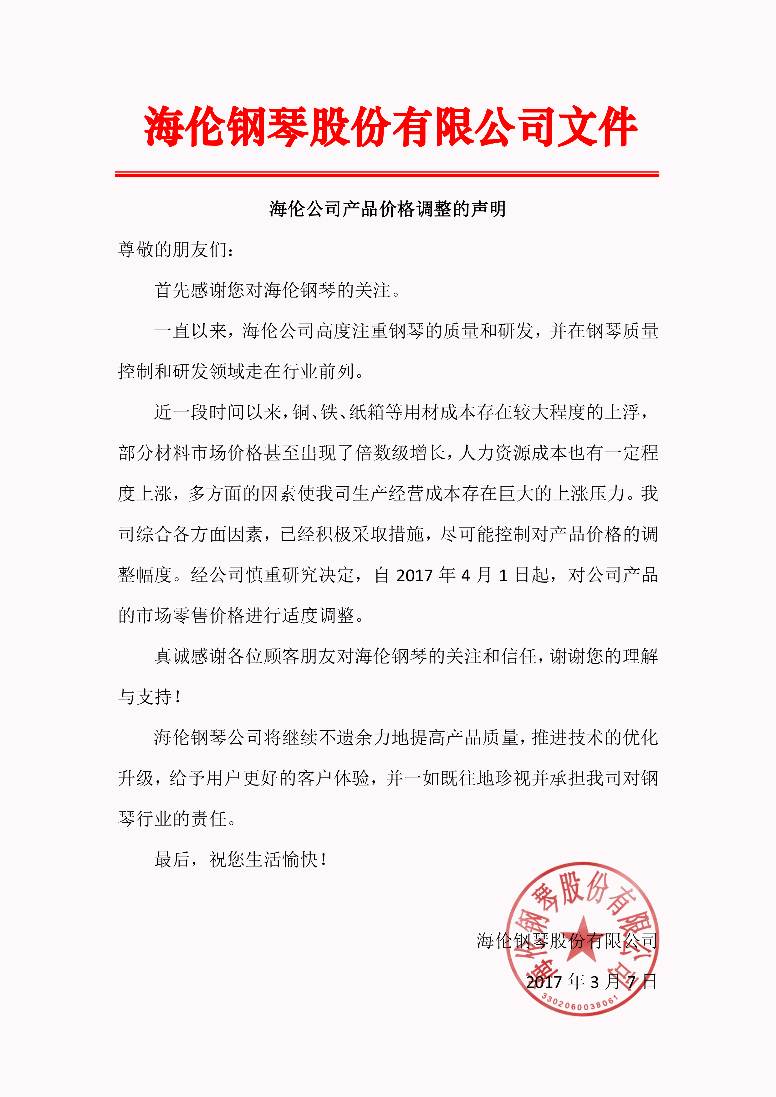 近一段時間以來,銅、鐵、紙箱等用材成本的市場價格存在大幅度的增長,加上人力資源成本的增加,對公司生產經營造成了不小的壓力。經海倫鋼琴股份有限公司董事會慎重研究決定,自2017年4月1日起,對公司產品的市場零售價格做出適度調整。具體請留意各官方網站的相應產品頁面。下附公司聲明文件。