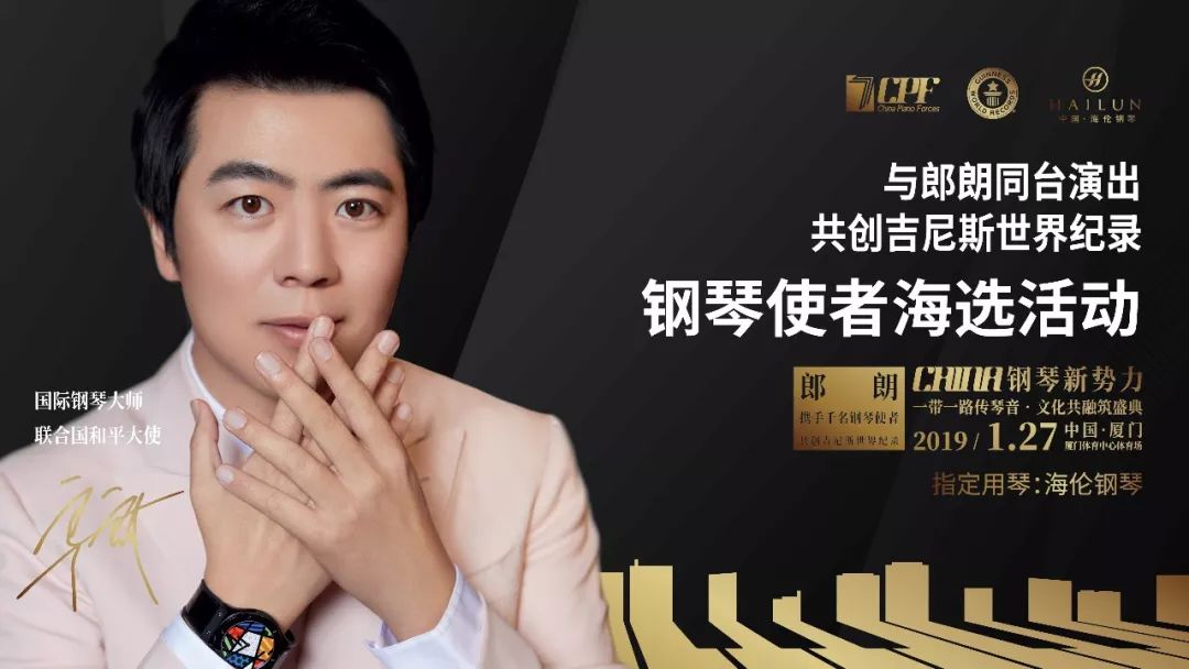 “一帶一路·文化共融”CHINA鋼琴新勢力——郎朗攜手千名鋼琴使者共創吉尼斯世界紀錄音樂盛典鋼琴使者海選活動即將開幕。該活動由著名鋼琴家、聯合國和平大使郎朗領銜,屆時,從“一帶一路”沿線國家(主要來自中國)海選出的1554名優秀鋼琴使者,將在777架海倫鋼琴上同時四手聯彈,或將與郎朗一起創造“最多鋼琴同時演奏的吉尼斯世界紀錄”。