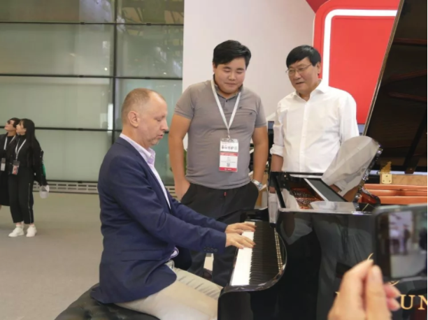 眾多來賓由海倫鋼琴董事長陳海倫與副總經理陳斌卓親自接待,陳海倫董事長向來自國外的朋友詳細介紹了維也納高端精品系列鋼琴的技術工藝優勢,并且安排專業演奏者向大家展示了海倫鋼琴出色的音樂演奏性能。