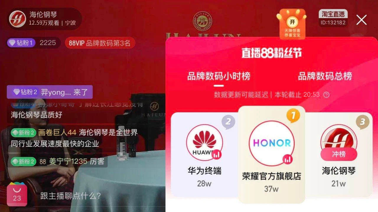 上品牌數碼品類最高第三名的好成績;一直持續到直播結束,海倫樂器旗艦店依然排