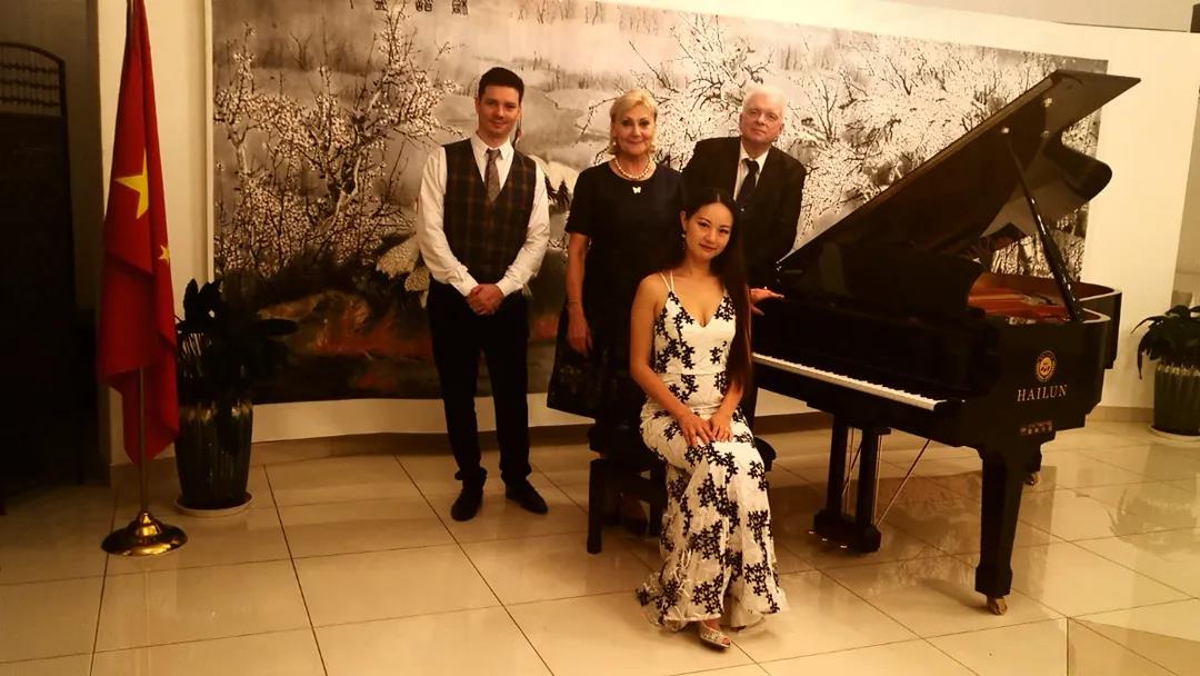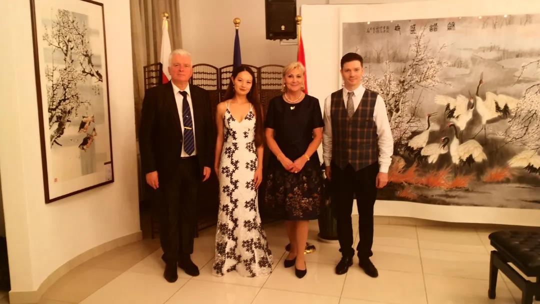 此次音樂會(huì)杜尚貝拉大使及夫人邀請100余位外交政要及各國大使參與其中,旅歐鋼琴家于微女士及斯洛伐克大提琴家揚(yáng).希斯卡先生為大家?guī)砹酥槁?lián)璧合的二重奏,同時(shí)置身于畫家張?jiān)伱穾淼臐M室梅花中,在此見證中斯藝術(shù)文化交流及友誼長存。海倫鋼琴華麗亮相,以優(yōu)美而富有感染力的音色為音樂會(huì)添彩。