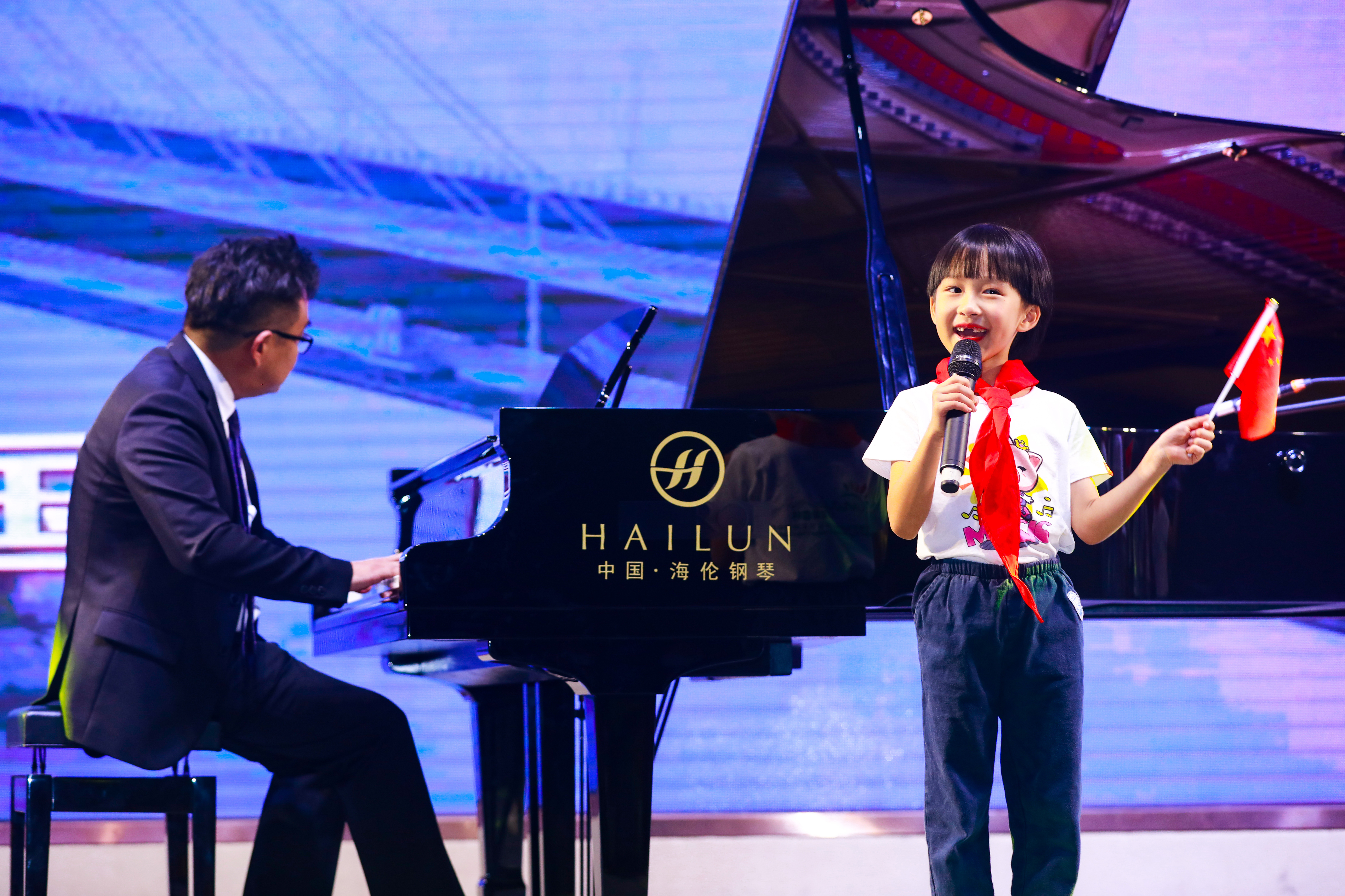 音樂會在童聲合唱中迎來了尾聲,以70架海倫鋼琴齊奏港珠澳大橋為背景,鋼琴家蔡領為中山魔音森林少兒聲樂藝術培訓中心的孩子們伴奏,給觀眾們帶來童聲合唱“我愛你中國”,深情獻禮建黨100周年和偉大祖國72周年華誕。孩子們天籟般的歌聲,展現了新一代中國青少年,對祖國的熱愛以及對未來的光明憧憬。