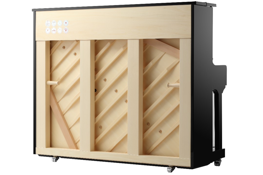 4、選用云杉實(shí)木音板,對(duì)于音質(zhì)、音色起到重要作用。采用不等厚不等寬梯形音板結(jié)構(gòu)。不等寬音板更大限度擴(kuò)大音板的有效振動(dòng)面積,特別是增加中高音區(qū)的有效振動(dòng)面積。弦列振動(dòng)時(shí)不同頻率與音板各對(duì)應(yīng)區(qū)域諧振,基于精確計(jì)算的不等厚音板和科學(xué)的弧形設(shè)計(jì),將音板與不同頻率的振波的諧振效果發(fā)揮到更佳。