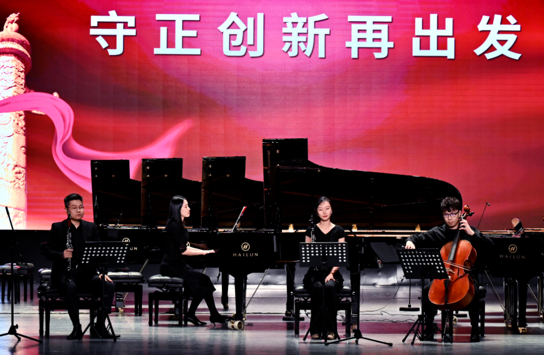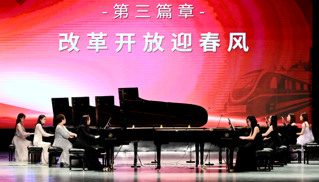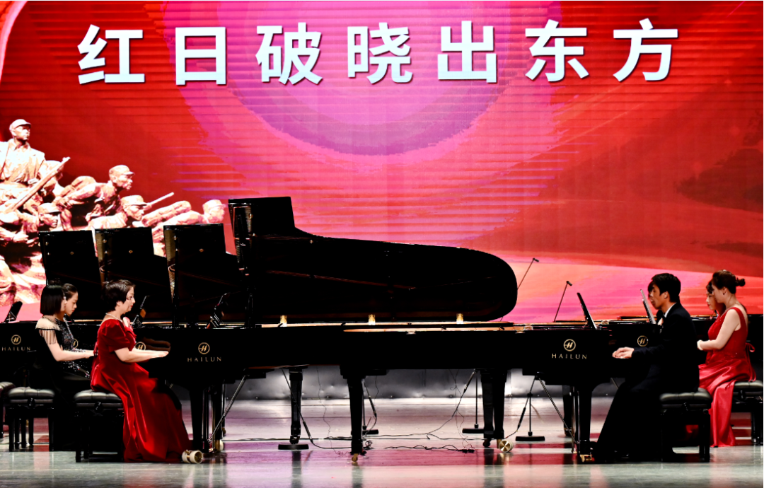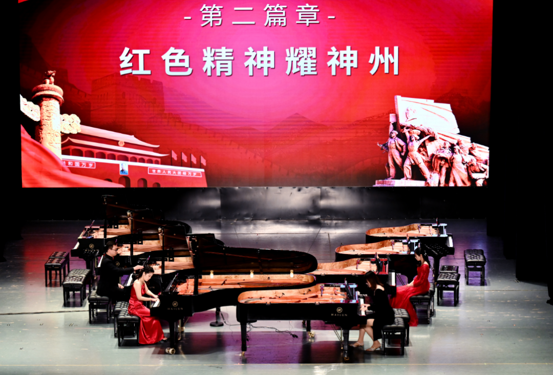 本場紅色主題音樂會根據(jù)黨史時間脈絡(luò),共分為開篇“覺醒新中國”、第一篇章“紅日破曉出東方”、第二篇章“紅色精神耀神州”、第三篇章“改革開放迎春風(fēng)”、第四篇章“守正創(chuàng)新再出發(fā)”、尾聲“啟航新時代”六個部分進(jìn)行。演奏作品極具年代特色,通過多鋼琴齊奏、四手聯(lián)彈、鋼琴薩克斯二重奏、室內(nèi)樂等多類演奏形式,伴隨著每一篇章,帶領(lǐng)聽眾們在音樂中追憶黨史,回味悠遠(yuǎn)的歲月。