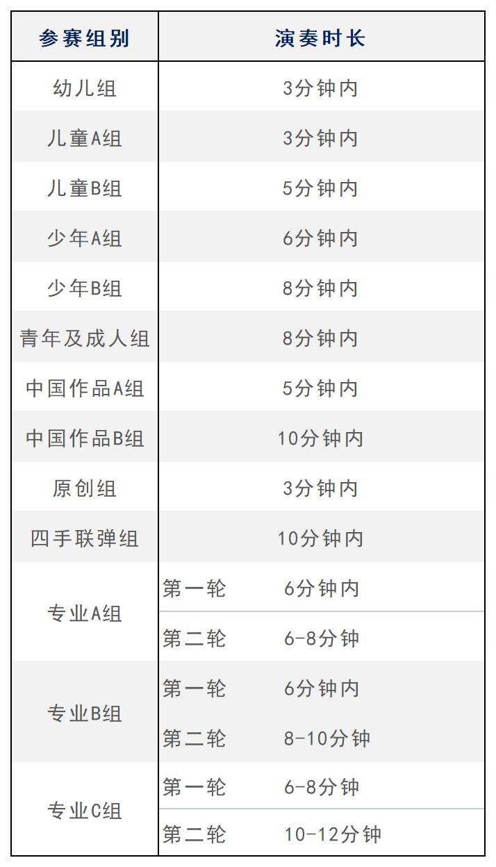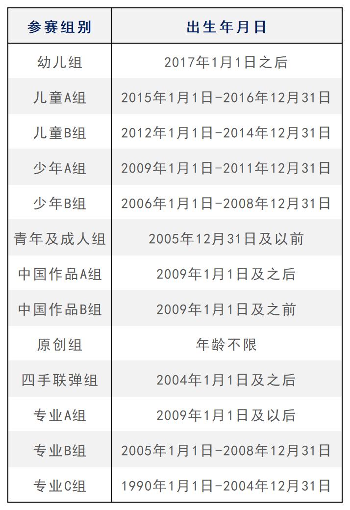 ● 業余組:幼兒組、兒童A組、兒童B組、少年A組、少年B組、青年及成人組,曲目自選。