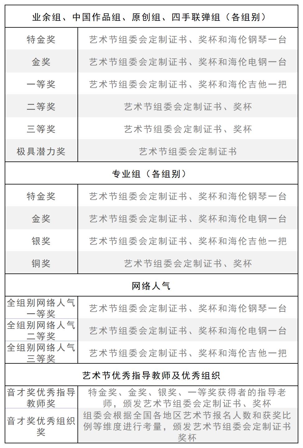 ● 本屆藝術節設置特金獎、金獎、銀獎、一、二、三等獎等多個獎項。專業組、業余組、中國作品組、原創組、四手聯彈組獎項設置如下(其中四手聯彈組獲獎選手證書或獎杯為每人一份,其他獲獎獎勵為每組一份)。