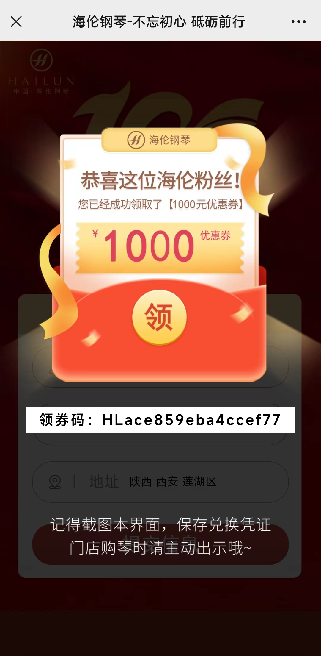 填寫信息領取獨屬于您的優惠券碼,記得保存領券碼截圖哦,有效期內憑領券碼截圖到當地海倫鋼琴官方授權店使用。(線下購買時,將姓名、電話號碼及領券碼展示給海倫鋼琴官方授權門店就可以獲得優惠啦)
