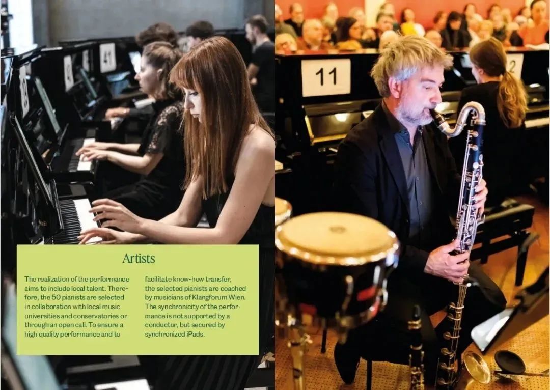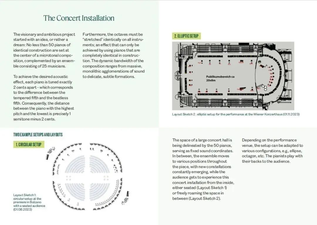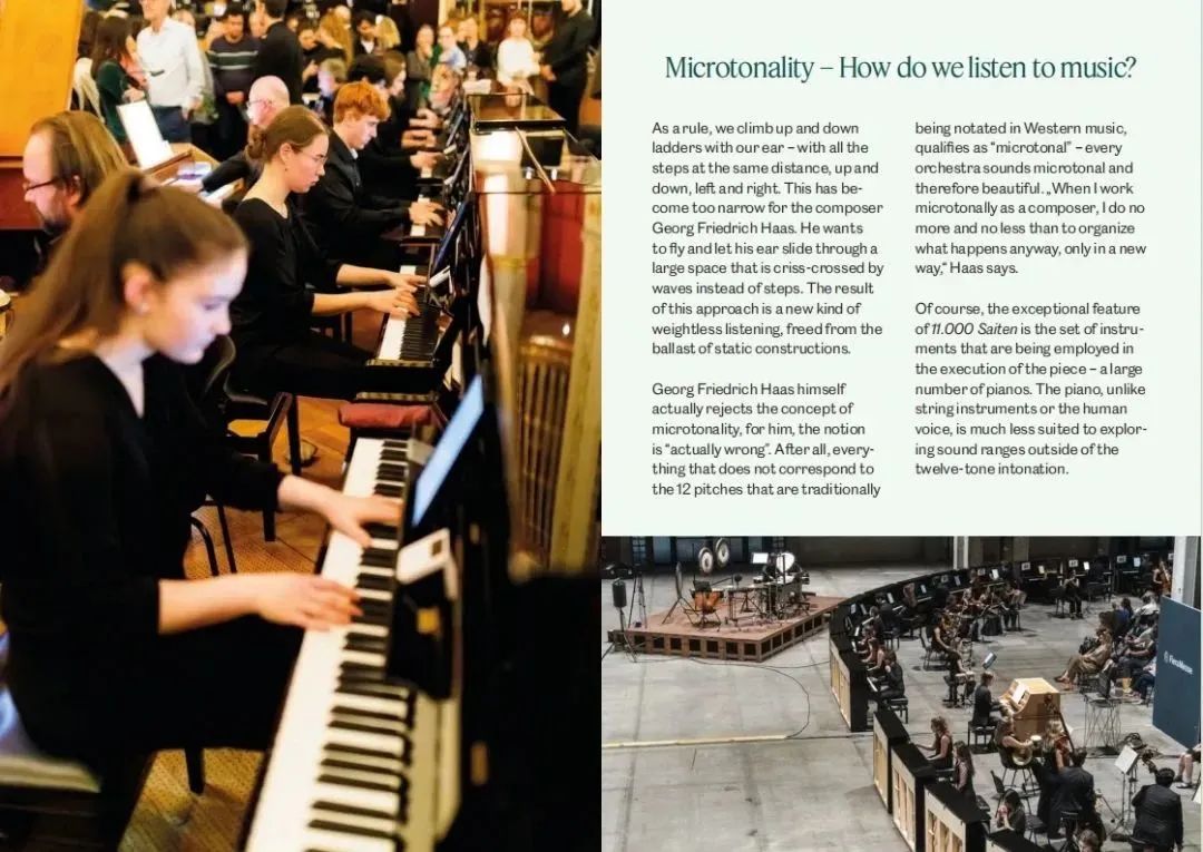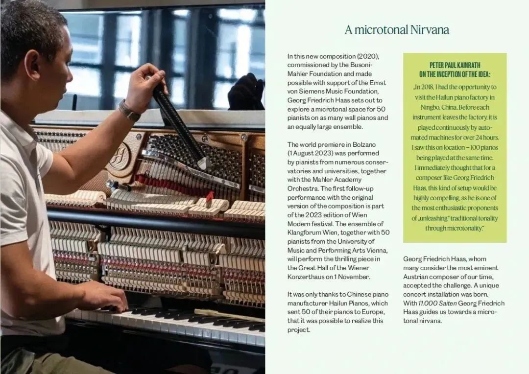 11000根琴弦,50架鋼琴,兩音分等差,絕對純律。這部從策劃開始就注定不平凡的作品始于一個想法,或者說是一個夢:在2018年,世界國際音樂比賽聯(lián)盟主席、維也納現(xiàn)代聲音樂團總監(jiān) - 彼得·保羅·凱涅夫先生 (Peter Paul Kainrath)有機會參觀了中國寧波海倫鋼琴工廠,發(fā)現(xiàn)每臺樂器出廠前,都要用自動配對的機器連續(xù)演奏24小時以上,彼得保羅在現(xiàn)場看到了100架鋼琴在同一時間播放,立刻想到對于像喬治·弗里德里希·哈斯這樣的作曲家來說,這種設置將是非常引人注目的,因為他是“通過微調(diào)性釋放傳統(tǒng)調(diào)性”的最熱情的支持者之一。