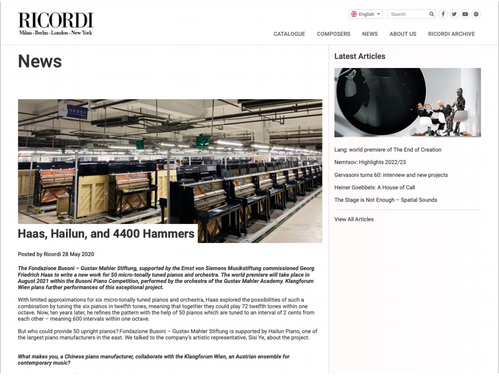 加強國際傳播能力建設,全面提升國際傳播效能,形成同我國綜合國力和國際地位相匹配的國際話語權,這是我黨為增強中華文明傳播力影響力作出的戰略部署。海倫鋼琴作為中國品牌參與到博爾扎諾國際藝術節項目中,搭建起了中國人民同世界各國人民有效互動交流的橋梁,讓世界更好讀懂中國,與世界各國攜手譜寫人類文明的新篇章。(意大利國際知名出版社RICORDI在2020年在網站及社交媒體專題報道了海倫鋼琴參與支持本次“宇宙之聲”項目)