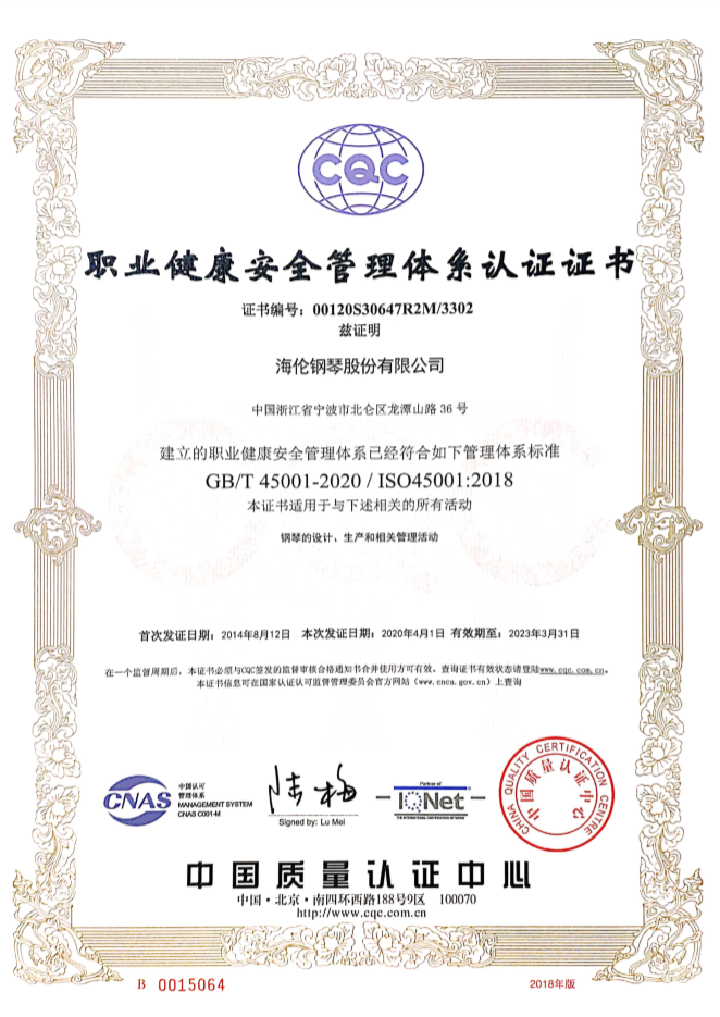 海倫鋼琴股份有限公司的生產作業和鋼琴制作符合國家職業健康安全管理體系認證。