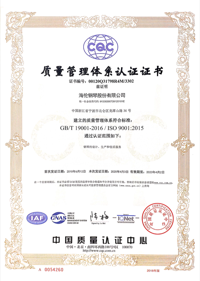 海倫鋼琴股份有限公司所生產的鋼琴和操作規范符合國家環境管理體系認證體系的規定。